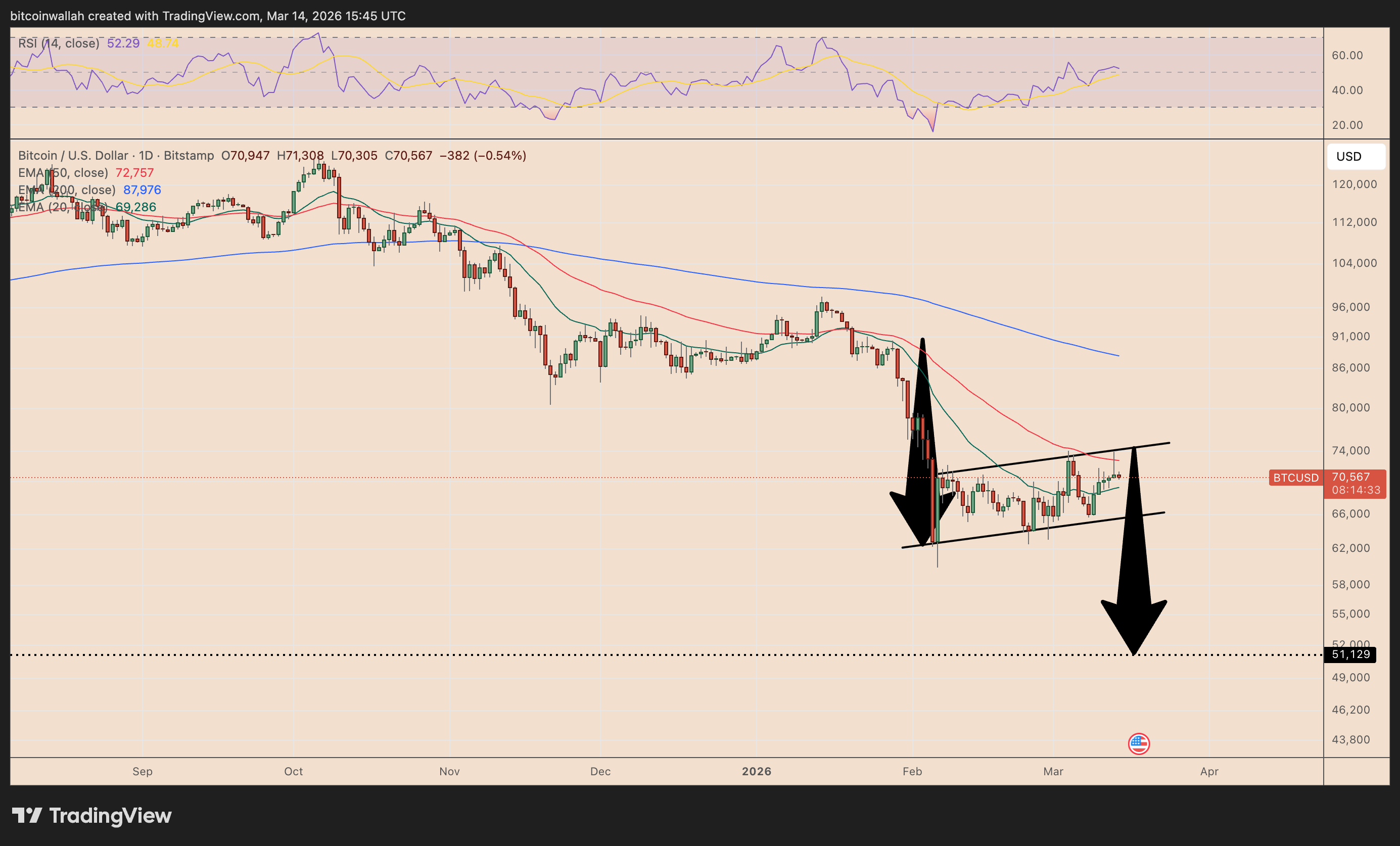 目前比特币价格在旗形上轨附近显现疲态,该区域与约72,750美元的50日指数移动均线形成共振阻力。