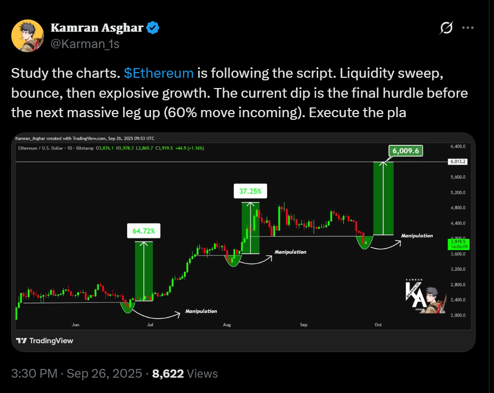加密货币分析师Kamran Asghar的研究显示,以太坊近期走势凸显出"剧烈下跌后暴力反弹"的循环模式。图表清晰呈现每次所谓的"操盘阶段"后都会迎来大幅上涨:7月涨幅64.72%,8月涨幅37.25%。这些形态表明市场骤跌并非偶然,而是为下一轮大涨清理弱势筹码的精心设计。