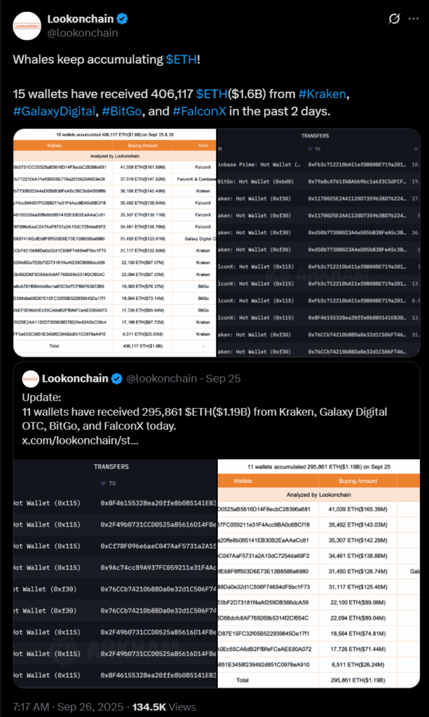 Lookonchain数据显示,过去两天至少有15个钱包各自增持超40.6万枚ETH(总价值约16亿美元)。这些ETH来源于Kraken、Galaxy Digital、BitGo和FalconX等主流平台,如此规模的转移暗示机构而非散户在主导这波操作。本轮吸筹恰逢本月初某巨鲸将数十亿美元从比特币转向以太坊后。