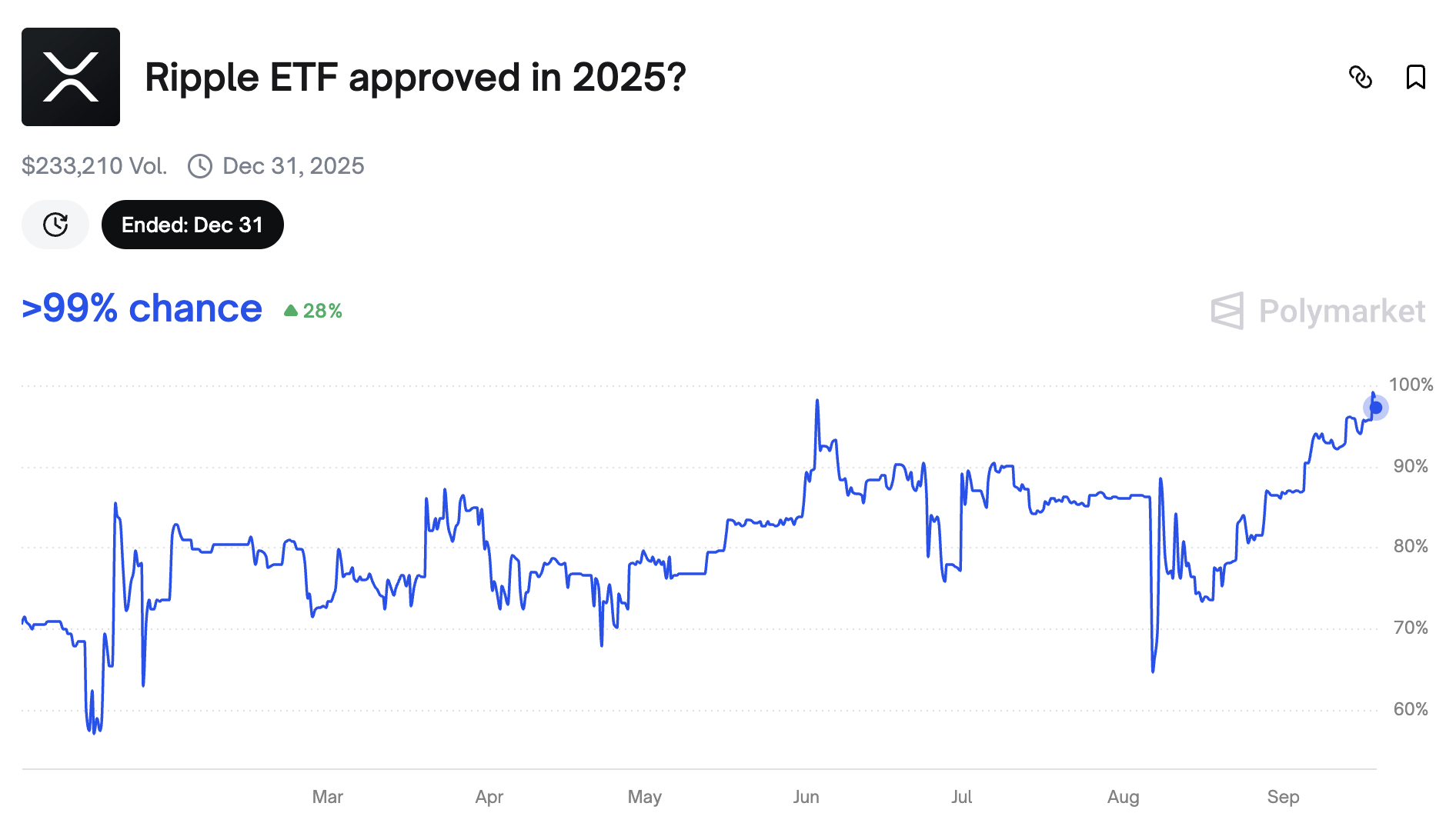 目前Polymarket参与者对SEC批准XRP现货ETF的预期概率超过99%。这一乐观预期配合利好消息,可能引发加密资产支持者期待的估值跃升。尽管SEC决定预计在未来数周公布,但美国政府部分停摆可能延缓审批进程。