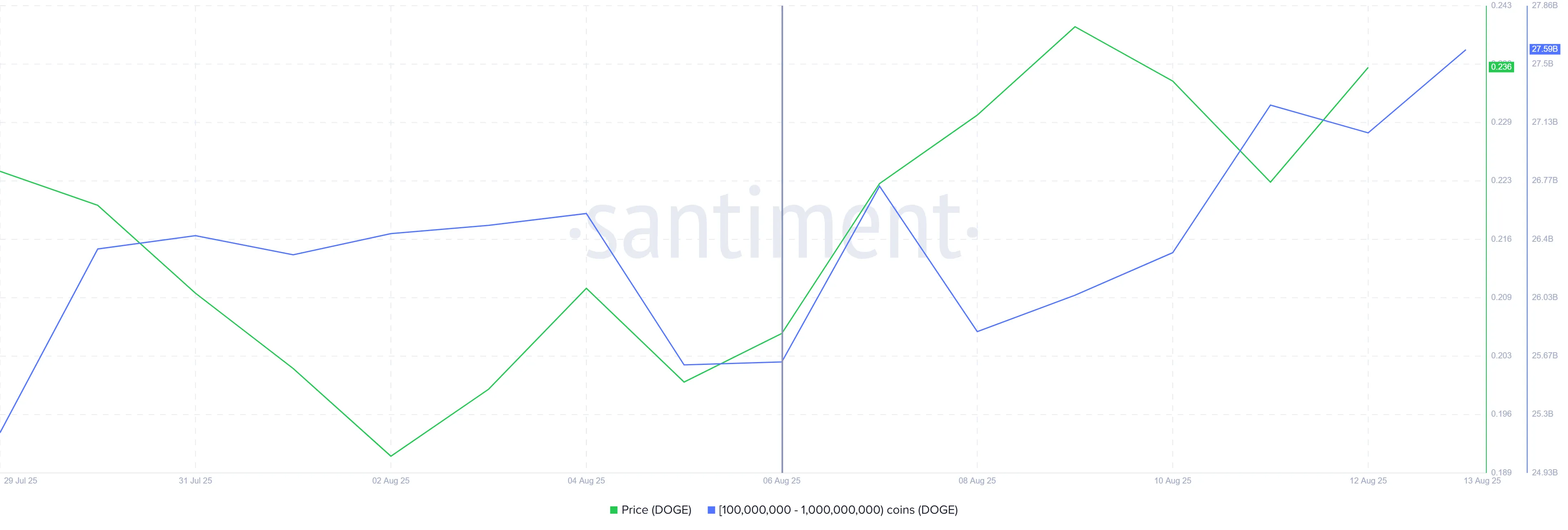 大额持币地址成为近期价格波动的主要推手,自月初以来持续释放看涨信号。过去一周内,持有1亿至10亿枚DOGE的地址累计增持超20亿枚,价值约5亿美元。这种巨鲸囤币行为彰显出对狗狗币未来潜力的强烈信心,为后续价格突破奠定了坚实基础。