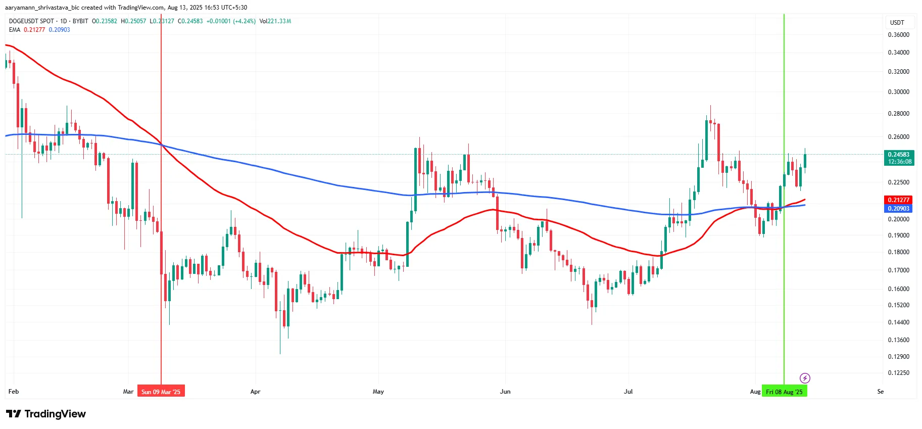 技术指标显示市场完成多空转换。50日与200日指数移动平均线(EMA)近期形成黄金交叉,标志着持续五个月(此前死亡交叉形成)的熊市周期终结,暗示狗狗币后市可能迎来更有利局面。这一关键指标意味着随着长期前景改善,该山寨币已准备好迎接新一轮增长。