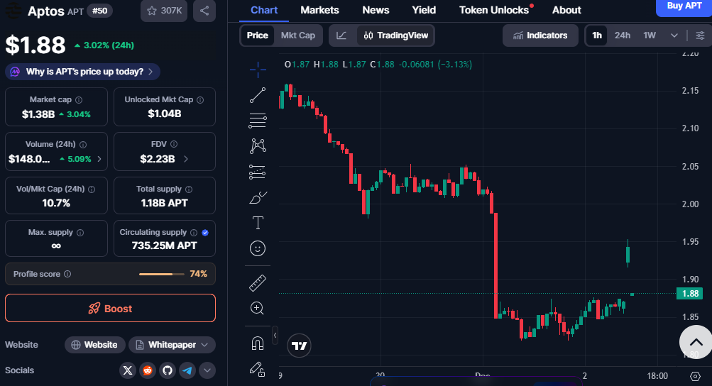 Aptos当前市值为13.8亿美元,过去24小时增长3.04%。这一增长表明尽管近期波动,投资者信心依然稳固。若跌破1.60美元支撑位,可能形成更大幅度的下跌趋势,交易者需保持谨慎。