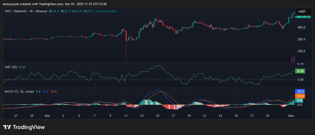 TAO的MACD指标线突破信号线形成金叉,买方动能增强预示潜在上行趋势。此外,0.26的Chaikin资金流向指标表明市场存在强劲买压,资金持续流入显示积累信号。