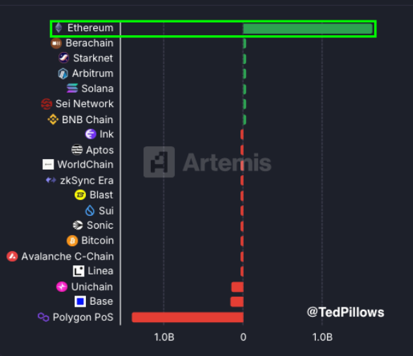Artemis数据显示上周净流入16亿美元,以太坊持续领跑所有公链的资金流入。当Polygon PoS和Avalanche出现资金外流时,以太坊巩固了其作为顶级流动性和结算层的地位。