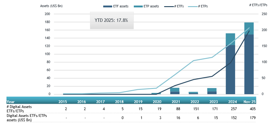 ETFGI行业版图报告显示,截至2025年11月底,全球加密货币ETF管理资产规模约为1791.6亿美元,较2024年底的1521亿美元同比增长约17.8%,表明该领域在市场波动中仍保持整体增长态势。