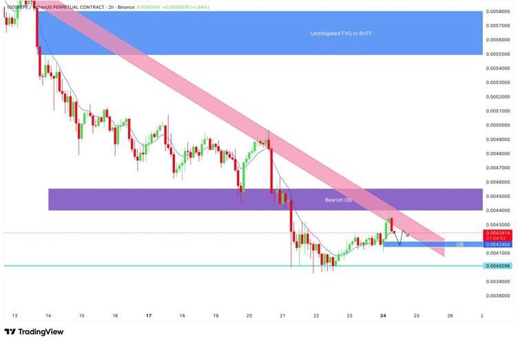 PEPE在币安2小时图上呈现1.5%涨幅,但当前仍处于下降趋势线下方运行。0.0044000处的看跌订单区块持续构成阻力,若当前价位失守,0.0041000需求区间可能提供支撑。