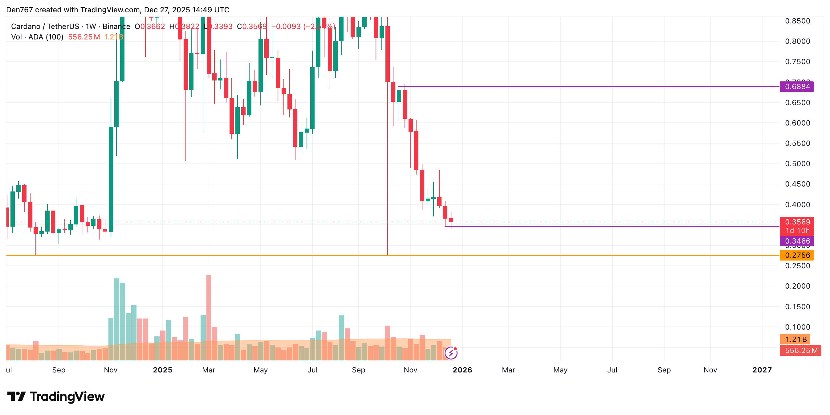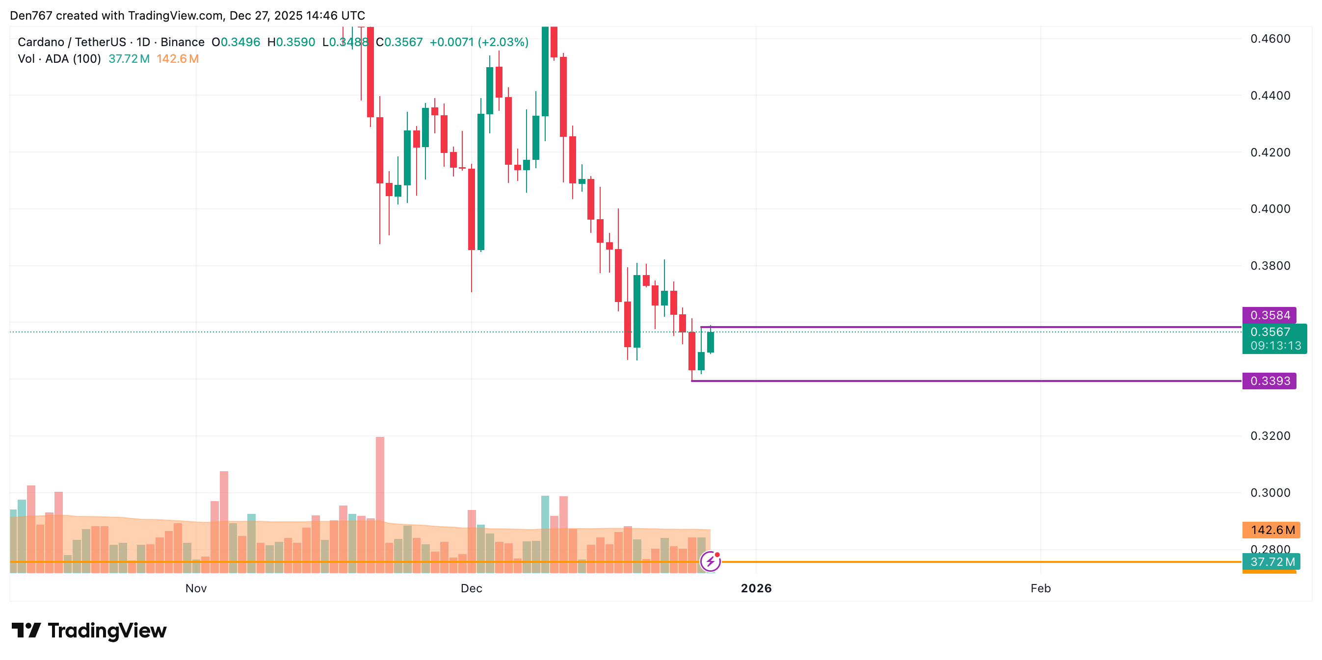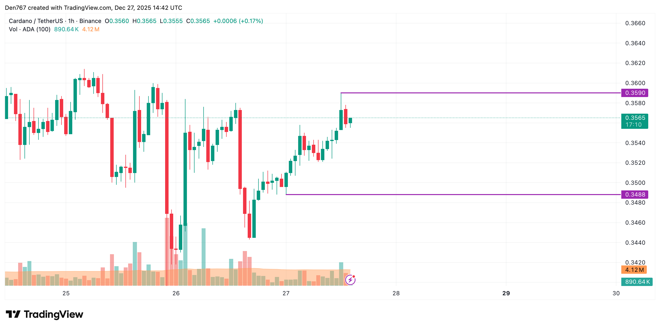 在小时线图上,ADA价格可能在0.3590美元处形成局部阻力。若多头能守住主动权且日线收盘价接近该位置,则有望继续上攻至0.36美元及以上区间。