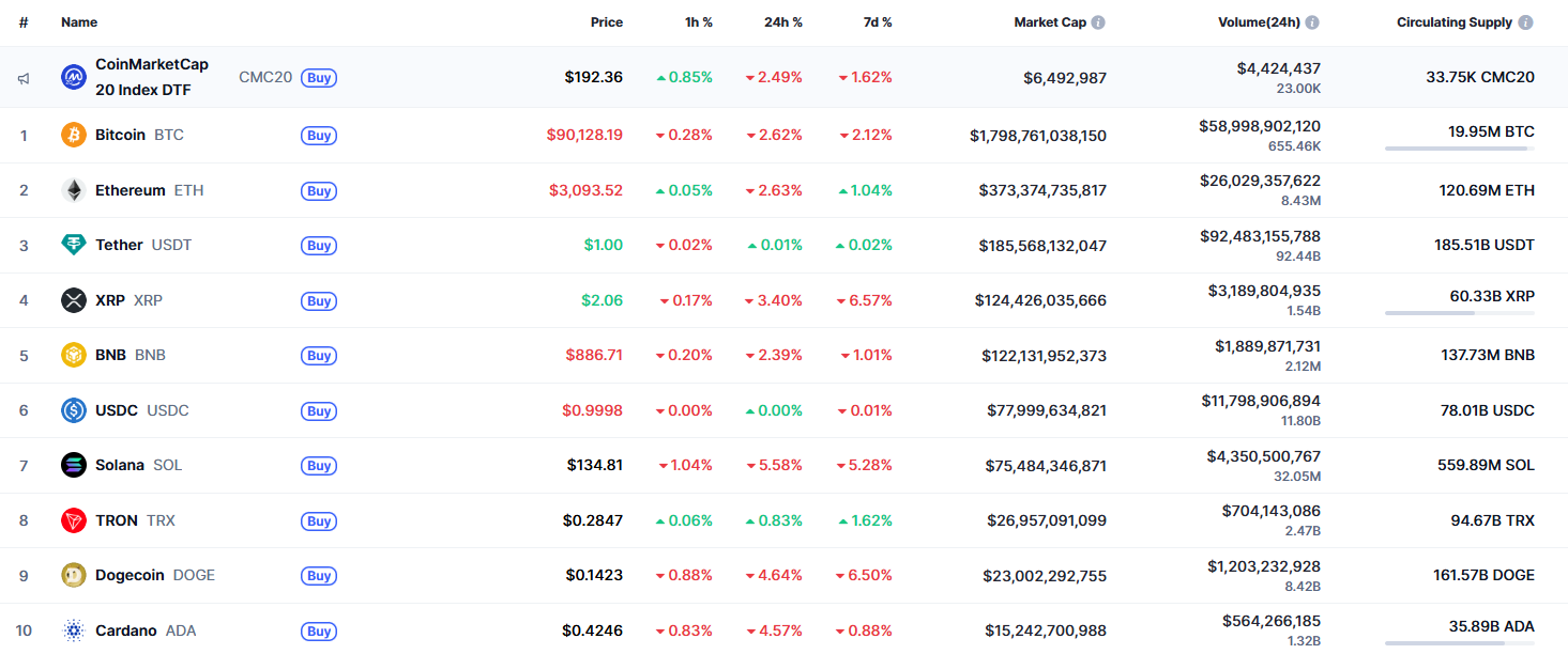 根据CoinMarketCap数据显示,本周最后一个交易日市场重回下跌态势。