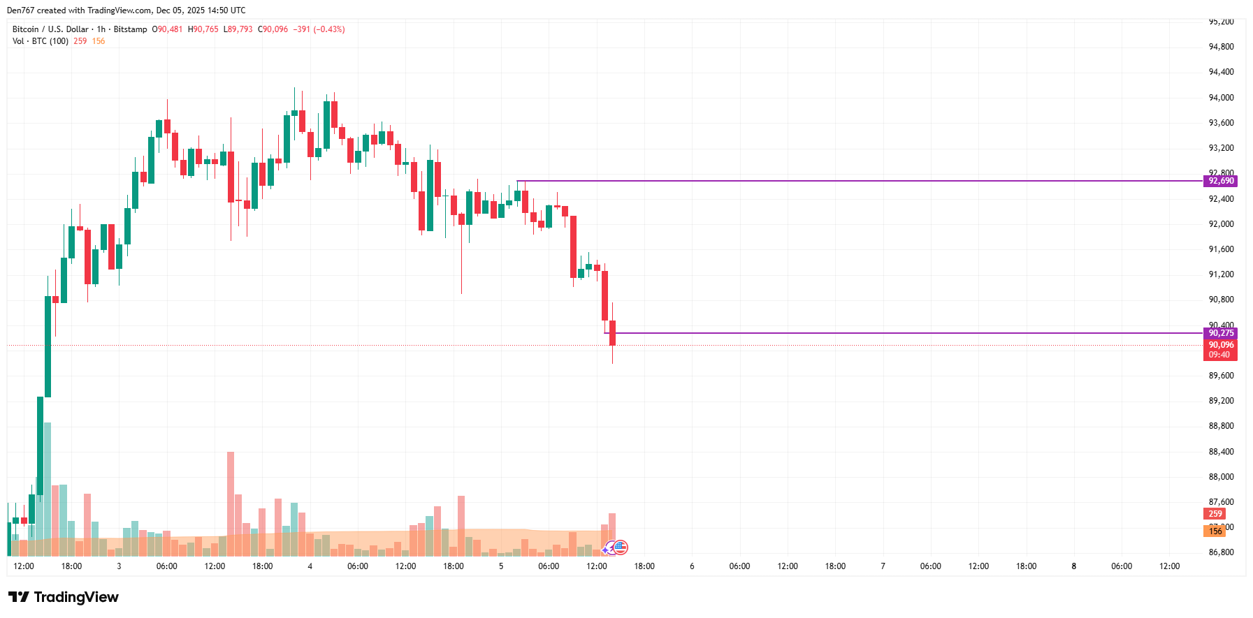 从小时线图观察,BTC在触及92,690美元局部阻力位后持续走低。若多头未能重新掌握主动权,预计价格可能进一步下探至89,000美元区间。