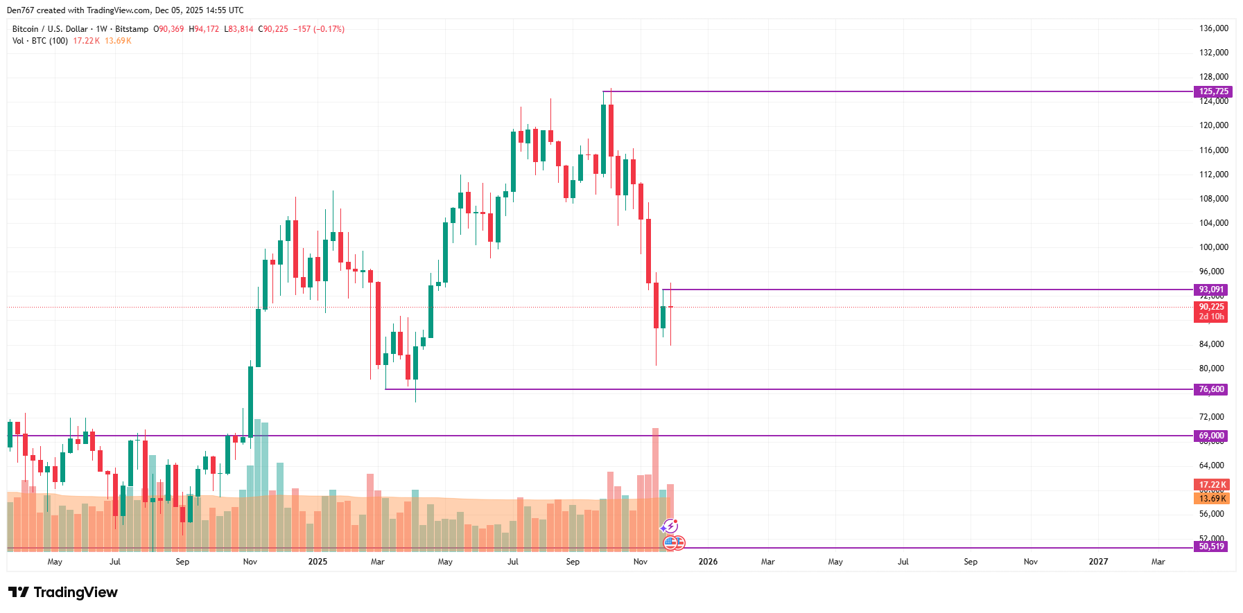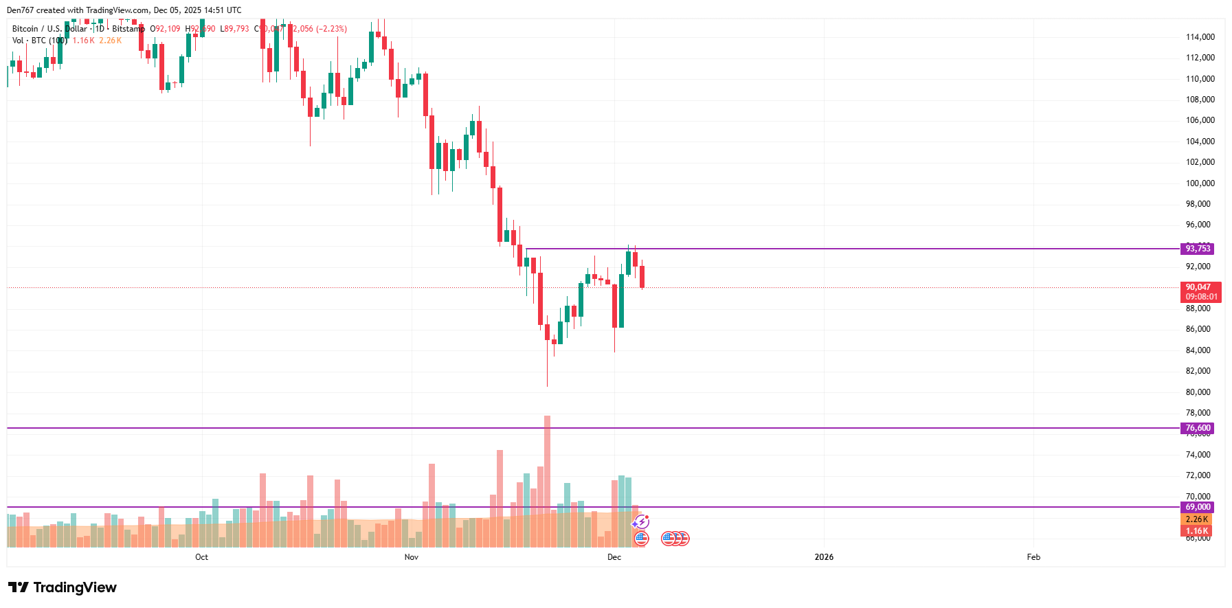 在更长周期框架下,主要加密货币再次未能有效突破93,753美元阻力位。若今日K线收于当前价位或更低水平,预计回调趋势将延续至88,000-89,000美元区间。