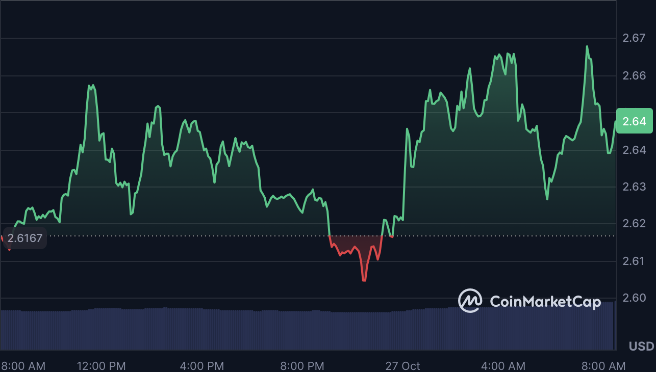 据CoinMarketCap数据显示,XRP当前交易价格约为2.64美元,24小时内上涨1.12%,单日交易量激增22.5%至43.3亿美元。尽管出现短期回升,但知名市场分析师EGRAG Crypto警告称,在实现持续性突破前,XRP可能面临强烈阻力。