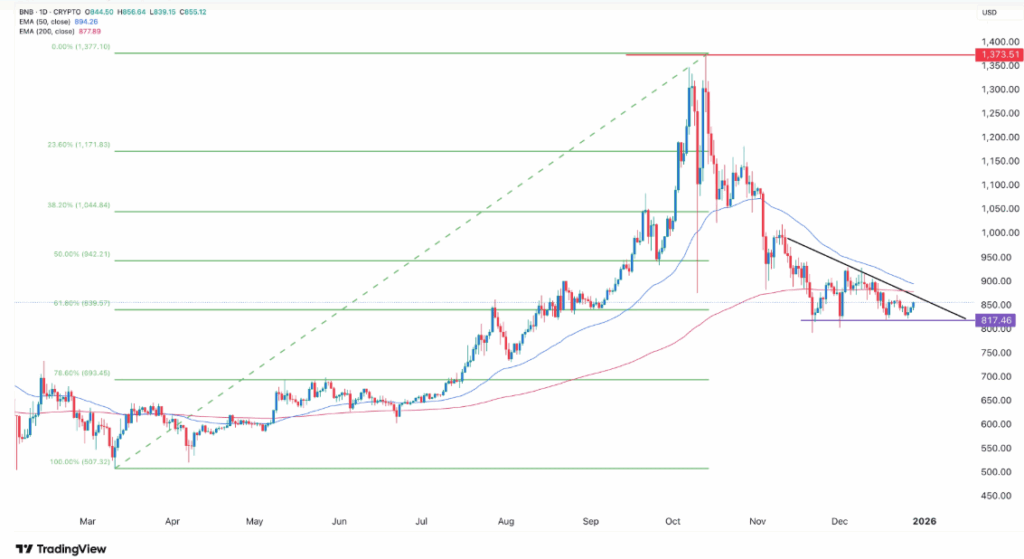 若BNB跌破三角形下轨817美元,可能进一步下探至695美元附近回撤位。若当前技术趋势延续且未出现强力看涨催化剂,此情景实现可能性较高。