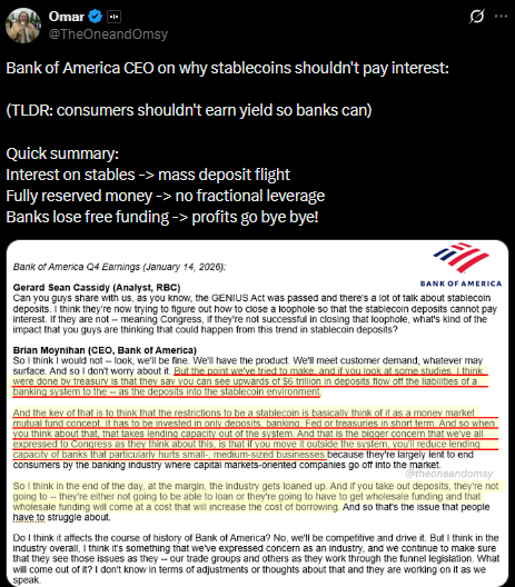 在美国银行的一份财报电话会议记录中,首席执行官布莱恩·莫伊尼汉警告称,生息稳定币的推出可能从传统银行系统抽走约6万亿美元。存款转移将使问题更加复杂,可能降低整体贷款能力并推高借贷成本。