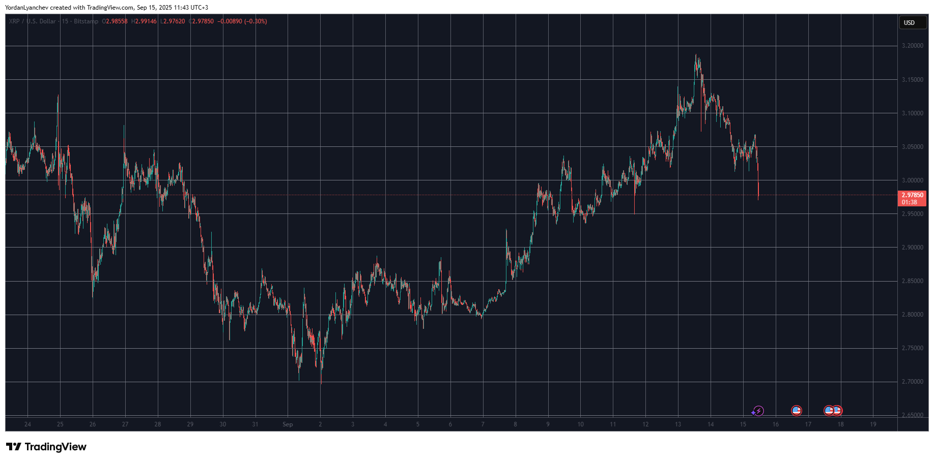 尽管XRP价格最初表现坚挺,但持续抛压叠加近期大盘回调,最终导致其跌破重要关口。该代币今晨已失守3美元支撑位,截至发稿仍在该水平下方挣扎,日内跌幅达3.5%,较周六高点回撤超6.5%。