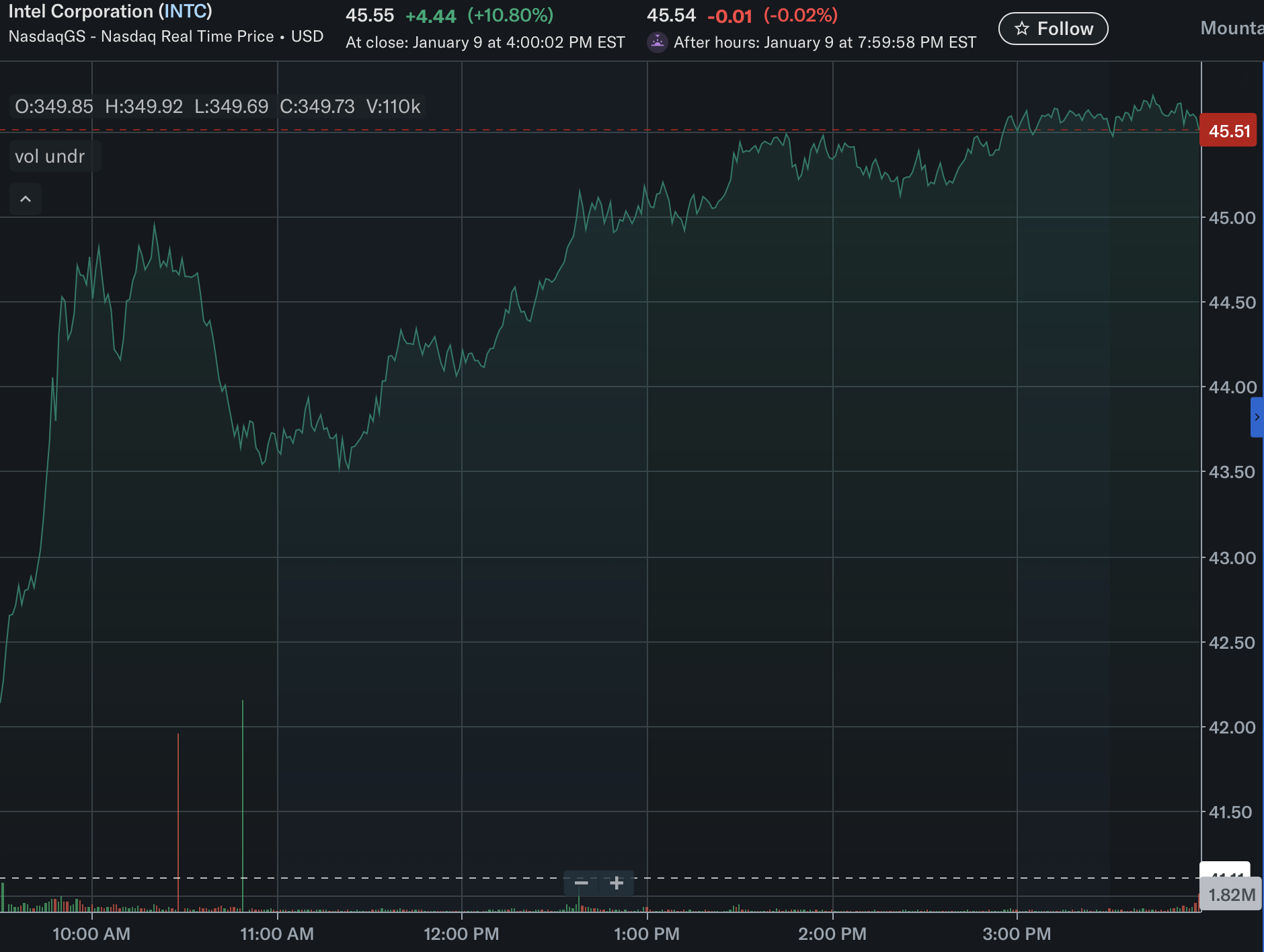英特尔公司股价于周五大幅上涨,单日涨幅达10.8%,收盘报45.55美元。此前特朗普总统公开赞扬了该公司的领导地位及美国本土制造战略。此次上涨是英特尔近年来最强劲的单日表现之一,标志着市场对其国内转型前景重拾信心。此番行情出现在特朗普与英特尔首席执行官陈立武会面之后,特朗普将会面形容为"非常成功",并强调英特尔最新芯片"完全在美国设计、制造和封装"。
