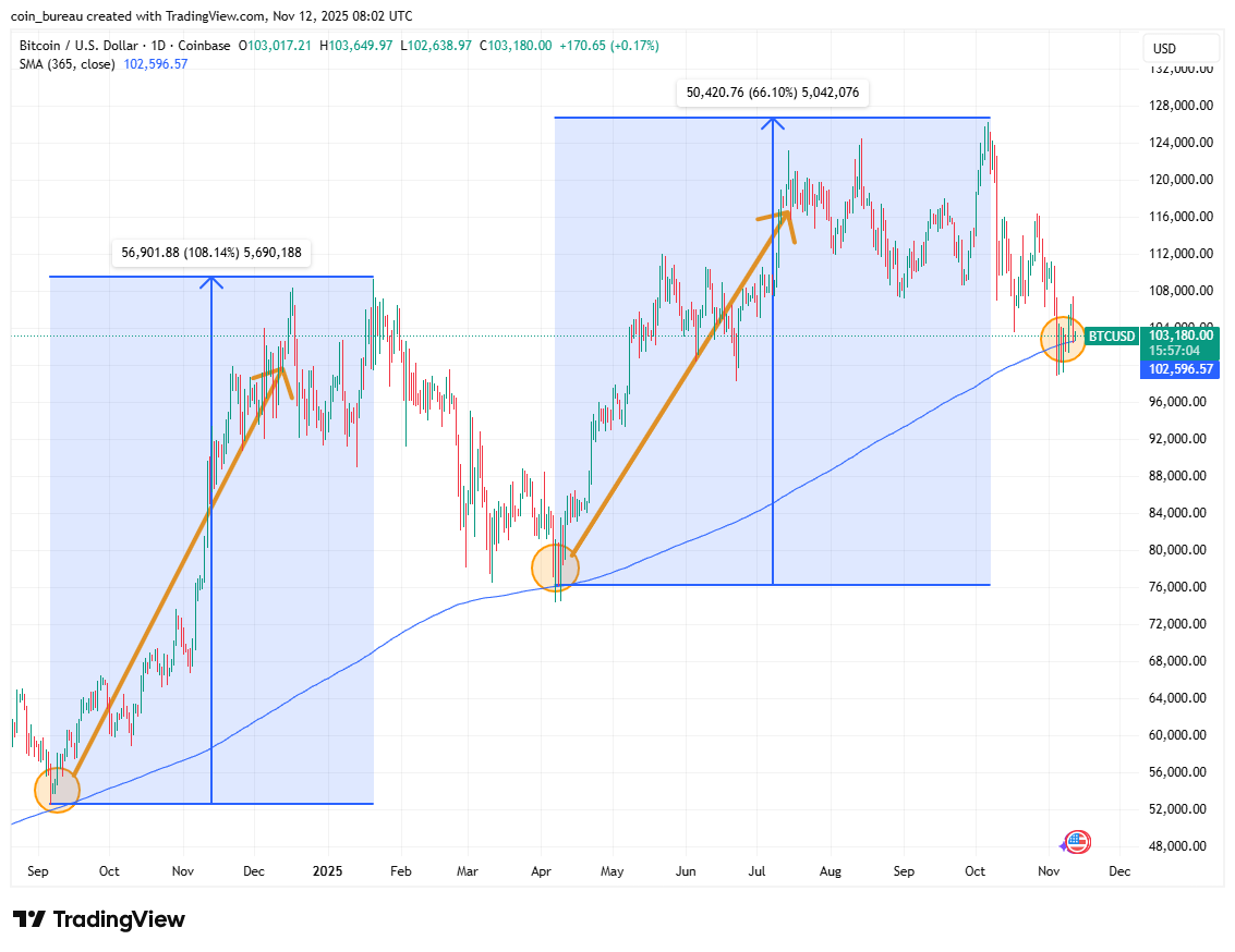 Coin Bureau数据显示,BTC刚触及365日均线,该位置曾在2024年11月引发100%涨幅,2025年4月触发66%上涨。