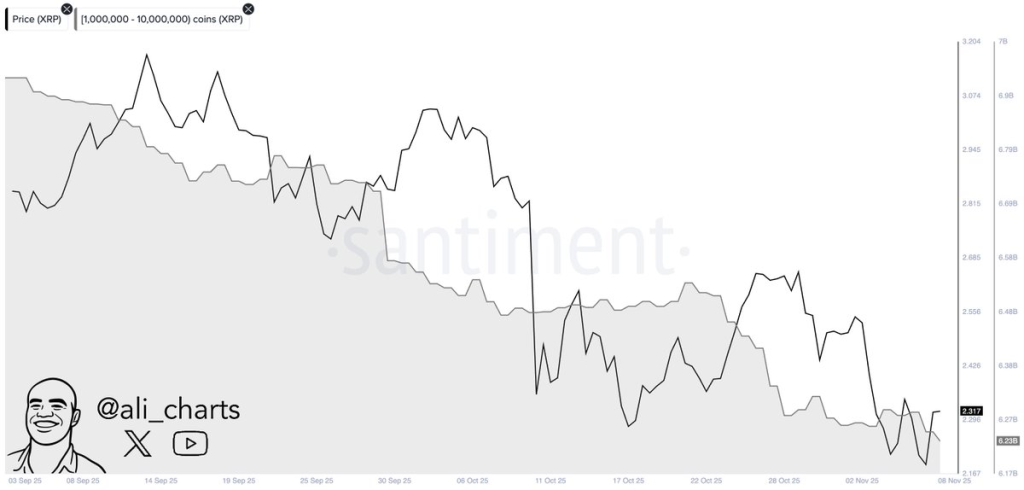 过去两天,持有100万至1000万枚XRP的地址减持约50万枚代币。分析师阿里·马丁内斯指出,这延续了自九月下旬开始的巨鲸持仓持续减少趋势。