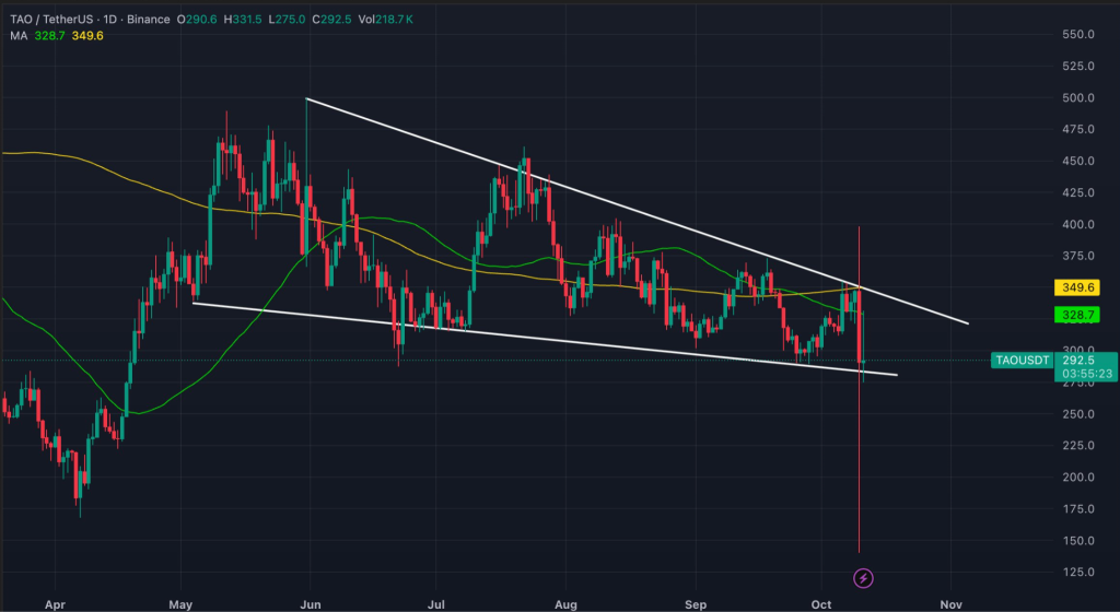 价格近期触及331.5美元高点后回落至275美元附近,呈现盘整格局。图表中的下降楔形模式表明看涨压力可能很快推动价格上行。