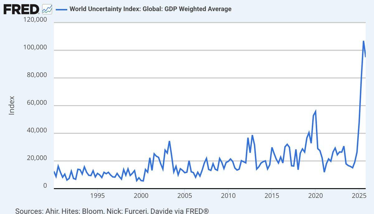 尼克:这肯定不是增长阶段,至少不是我们习惯的那种形式。我们正在步入一个机会窗口更宽广的时代,随之而来的是,你需要驾驭混乱。世界不确定性指数在2025年达到顶峰,并在2026年持续飙升。波动性更高,投资活动减少,人们不知道该如何应对。