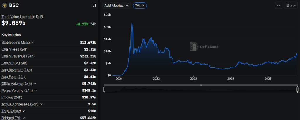 DeFiLlama数据显示,BNB智能链(BSC)以96.9亿美元总锁仓价值成为第三大区块链网络。仅过去24小时就记录252万活跃用户,处理逾2,070万笔交易。