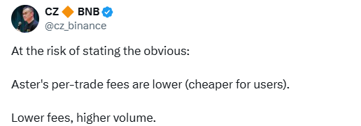 "即便道出显而易见的事实:Aster的交易手续费更低(对用户更经济)。低费率意味着更高成交量。"