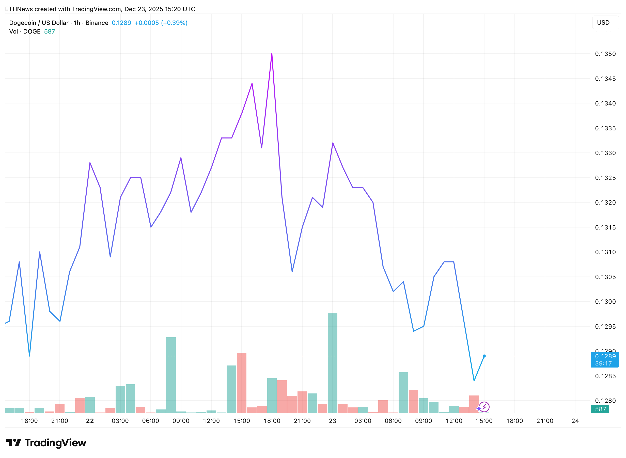 狗狗币目前交易价格约为0.129美元,在经历短期回调后正尝试企稳。尽管市场整体情绪仍保持谨慎,但最新价格形态表明卖压可能正在减缓而非加剧。短期价格走势与高时间框架结构均指向市场正处于收敛状态,而非破位下行。