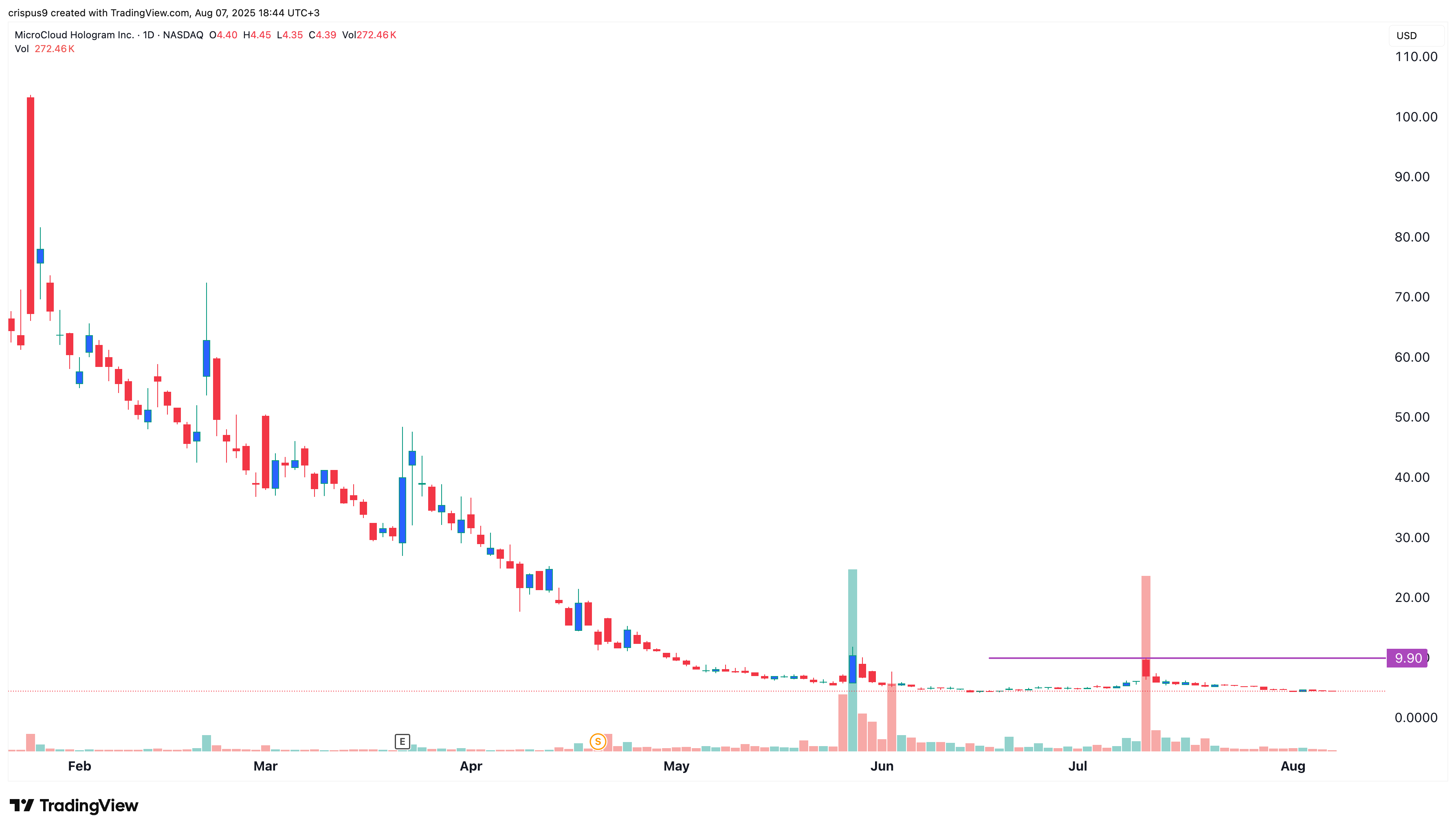 • HOLO股价年内维持窄幅震荡,与比特币涨势形成背离