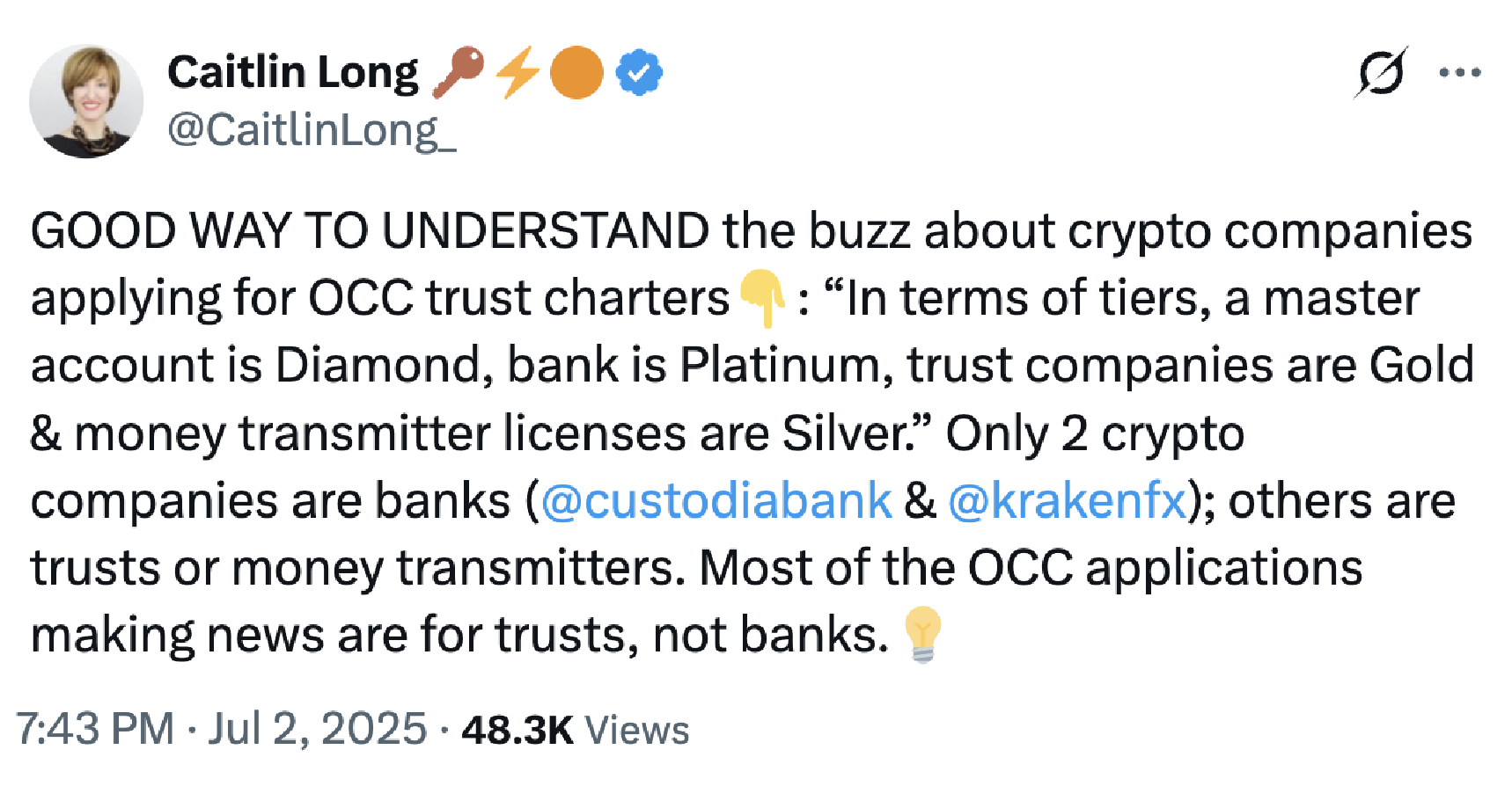 Custodia银行创始人兼首席执行官凯特琳·朗在今年7月的推文中形象比喻:"按层级划分,主账户是钻石级,银行是白金级,信托公司是黄金级,货币传输许可则是白银级",并强调Custodia与Kraken是"仅有的两家具备银行资质的加密公司"。