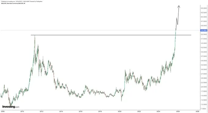 白银近期呈现惊人涨势,接连突破关键阻力位,引发交易员与分析师的广泛关注。投资分析师拉沙德·哈吉耶夫分享的图表显示,银价几乎呈垂直攀升态势,已远超此前周期高点。