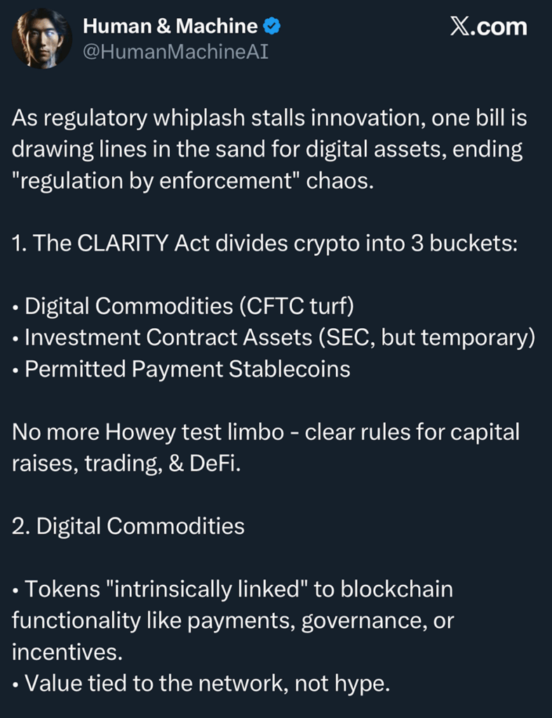 法案明令禁止交易所与客户对赌交易,旨在防范类似FTX暴雷前的利益冲突。这些保护性条款可能推高合规成本,对资金有限的中小平台构成压力。草案沿袭了此前《清晰法案》的立法思路,进一步明确CFTC对现货市场、SEC对证券型代币的管辖权,并首次引入联合规则制定机制以厘清混合型代币的监管灰色地带。