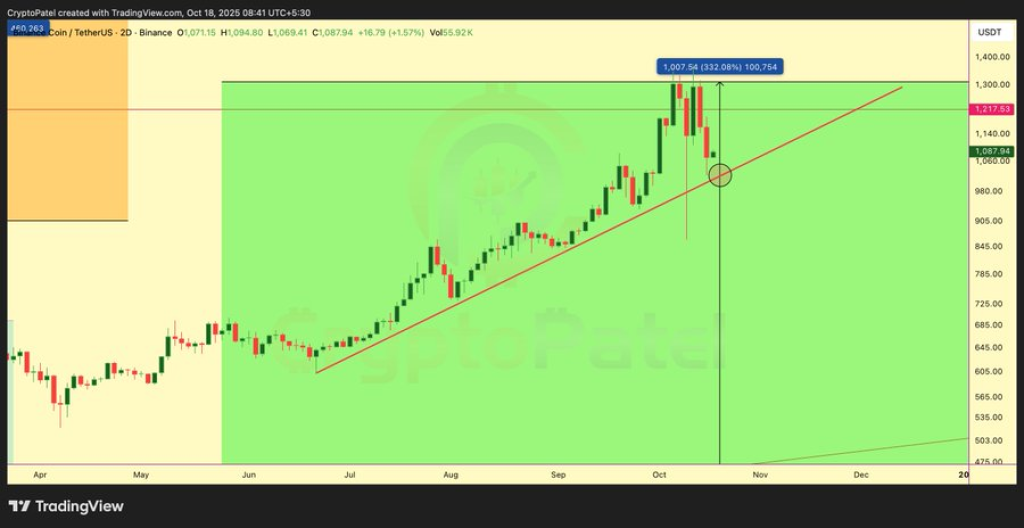 当前价格再次触及1000美元区间的趋势线,形成决定性十字路口。Patel认为守稳该位置将维持看涨结构,若在此构筑坚实防线,未来数周或重启涨势剑指2000美元。