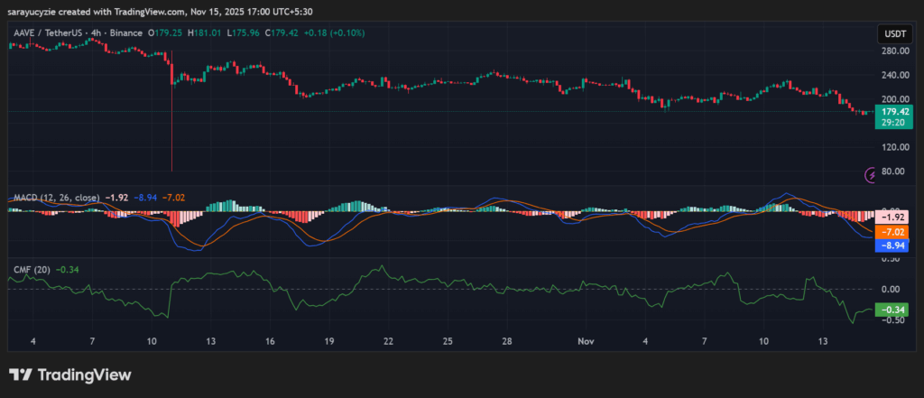 AAVE的MACD指标双线均位于零轴下方,显示整体趋势偏空。下跌动能持续占优,当前价格运行于平均趋势强度之下。资金流量指标(CMF)报-0.34,表明抛压显著。资金持续外流与看跌情绪形成共振,价格动能明显减弱。