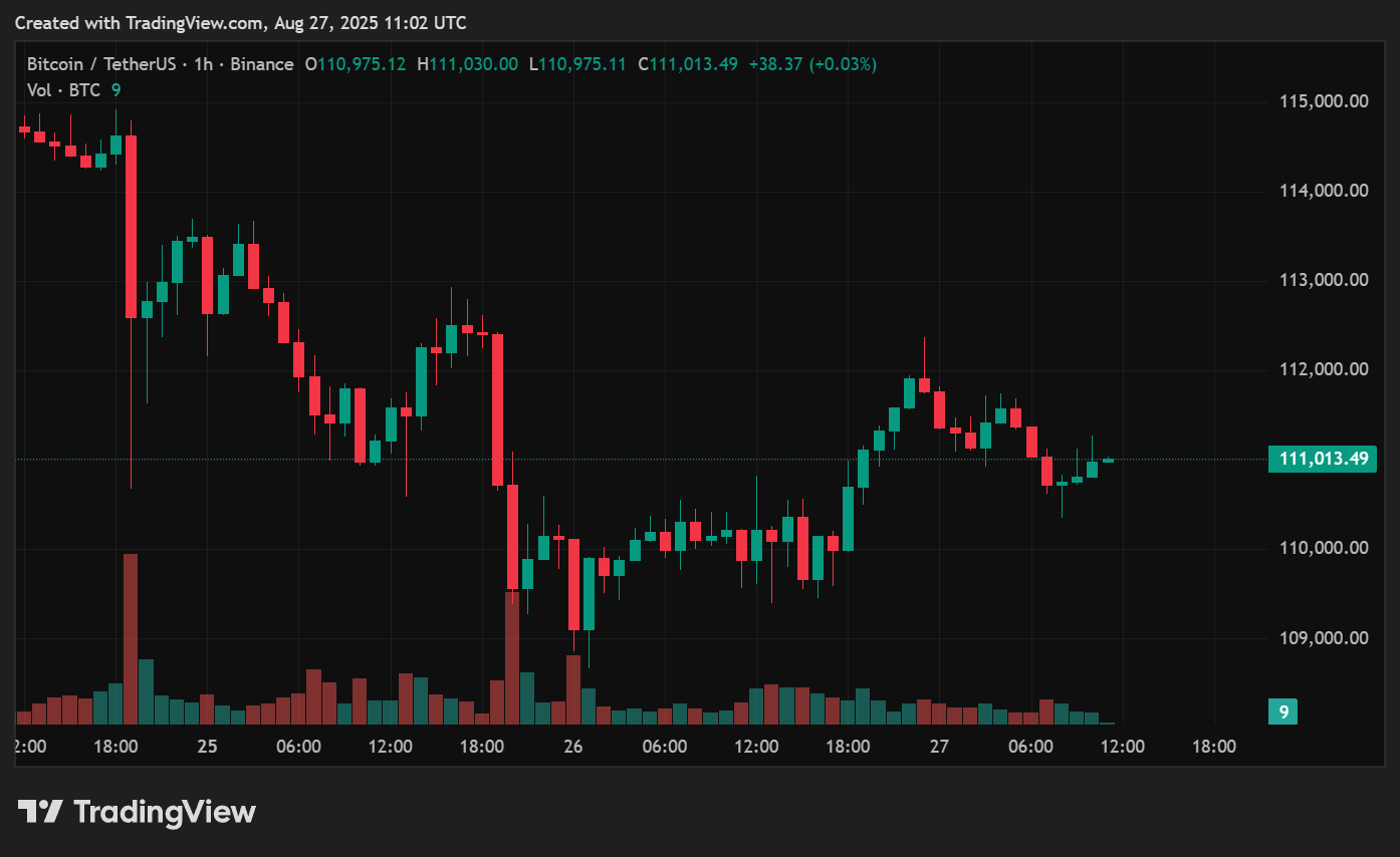 截至发稿,比特币交易价约为111,013美元,日内高点112,346美元,低点109,493美元。这个波动区间既体现了回升尝试,也反映了上周暴跌后持续的抛压。