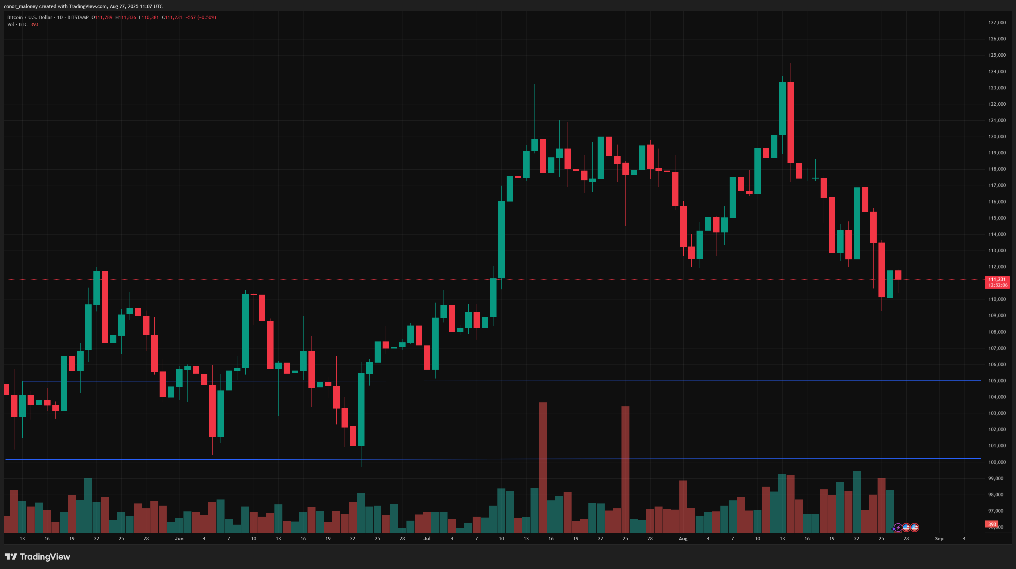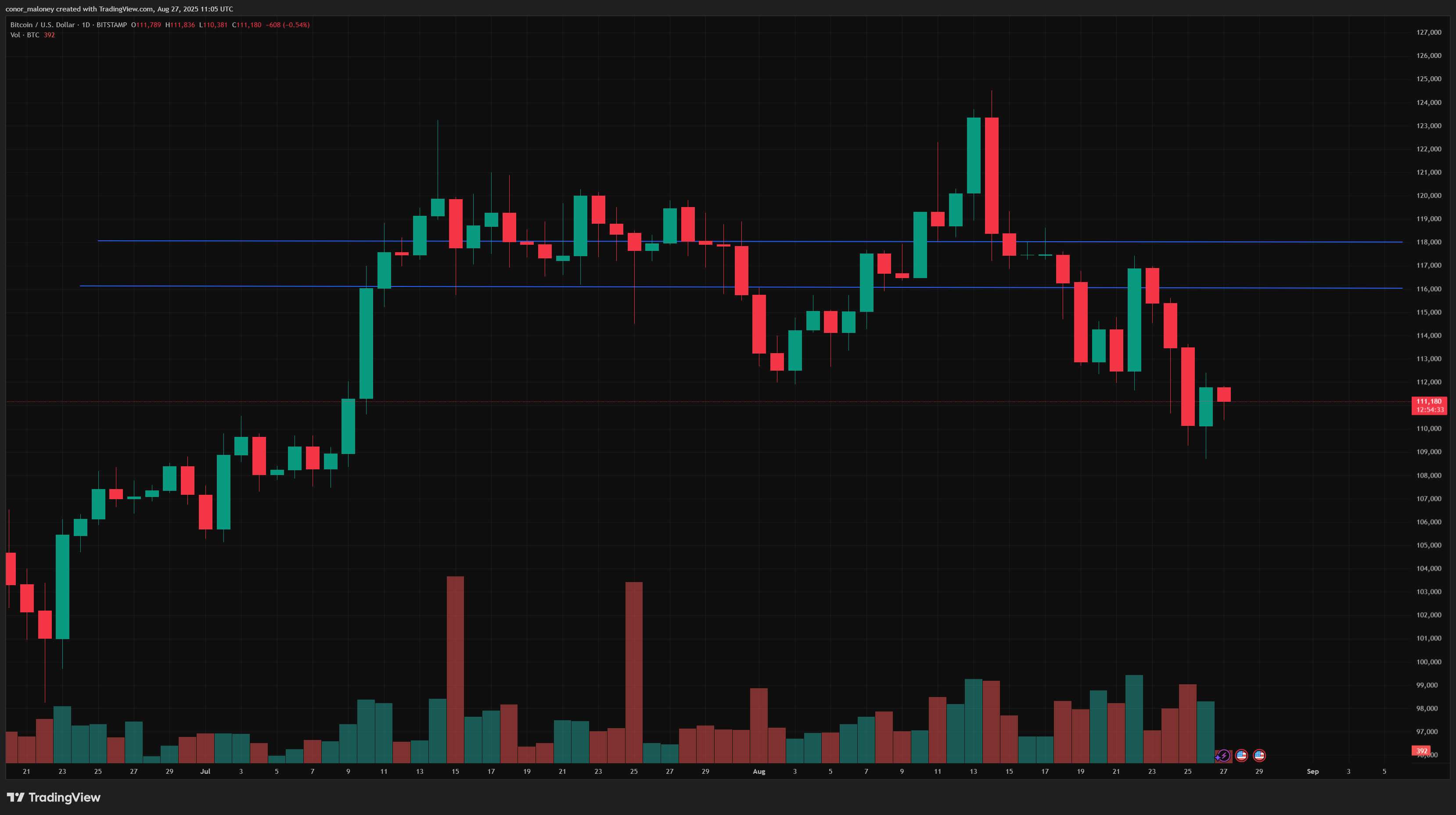 目前11万美元仍是关键分水岭。持续守住该价位将展现市场韧性,失守则可能引发更深回调。上方阻力位于113K-115K区间,下一重要阻力位在118K-120K。