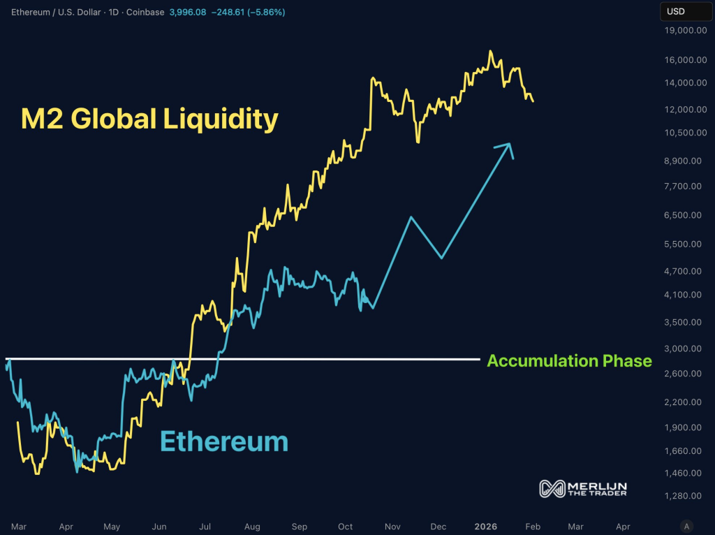 交易员Merlijn表示:"以太坊走势落后于全球M2流动性。当前全球流动性正在上升,机构买单正在堆积。"他补充称,一旦质押获得全面认可,最不受待见的上涨行情将启动,长期目标看至1万美元。