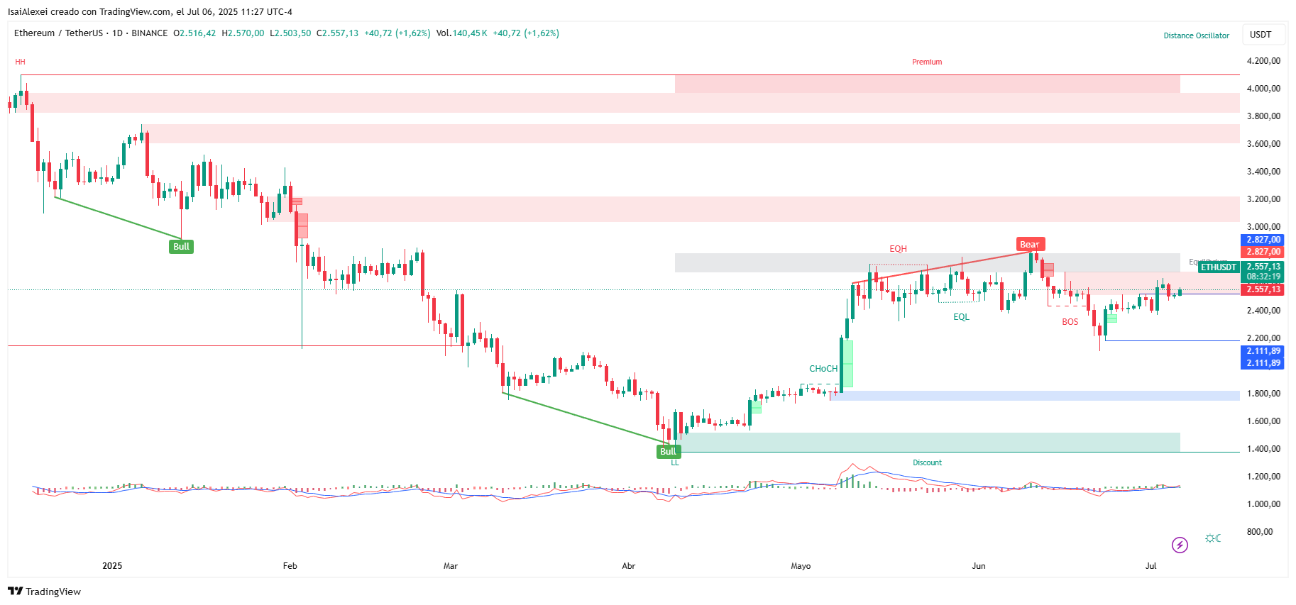 以太坊呈现中性偏多格局,日线与周线指标均发出"买入"信号,月线趋势保持中性。价格目前维持在2,480-2,500美元支撑带上方盘整,交易员正密切关注2,600-2,650美元区间的突破机会。