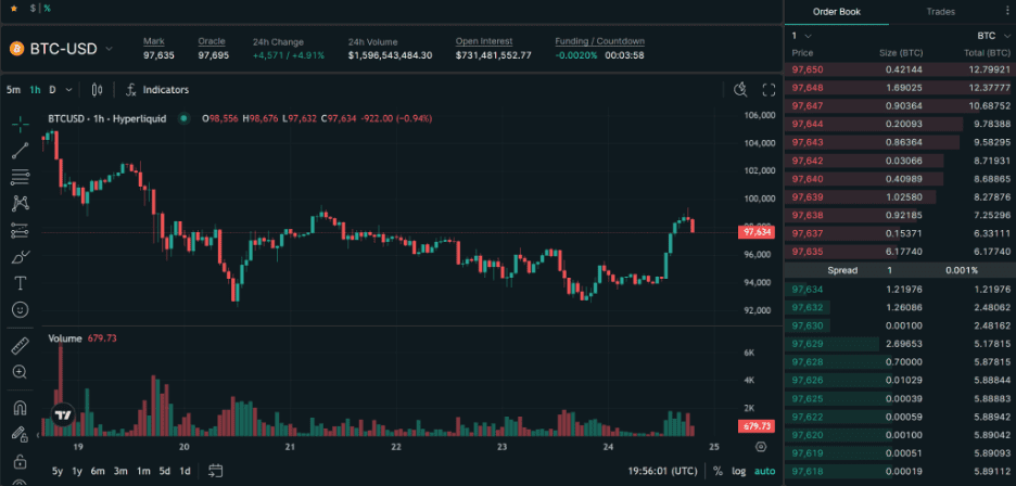该协议结合了CeFi和DeFi的元素,为用户提供了一个高性能、低滑点和用户友好的平台。它还支持多种加密货币和创新的功能,如规模订单、Hyperps、复制交易金库以及为DeFi开发者提供的工具。