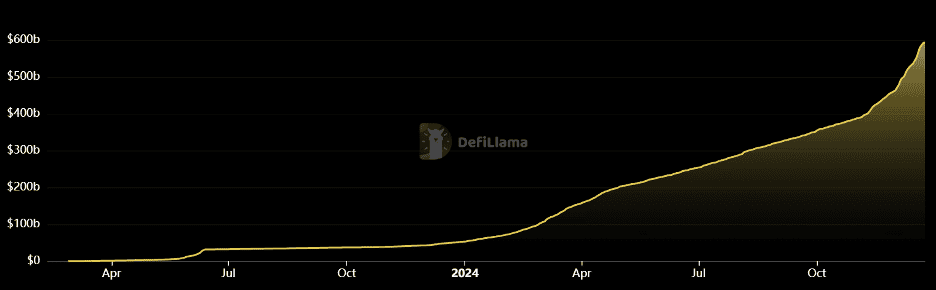 但Hyperliquid的优势不仅仅在于支持的代币数量或用户友好的界面。该项目为交易者提供了如此多的功能和交易选项,以至于其永续合约的总交易量在不到两年的时间内已超过6000亿美元,如下图所示: