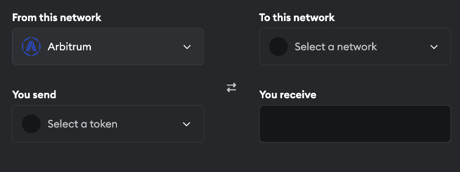 现在,点击“桥接”,它位于钱包顶部中央。这将引导您进入一个看起来像这样的页面: