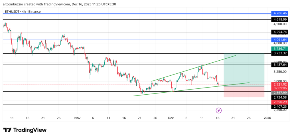 以太坊价格在上升通道内持续收窄,目前正测试通道下轨支撑。在触及通道上轨后经历大幅回调,现交投于2927.4美元附近。此前经过一段震荡收缩后波动率再度扩大,K线正在测试关键反应区域。上方的EMA均线集群形成压力,迫使交易者密切关注关键价位的明确方向信号。
