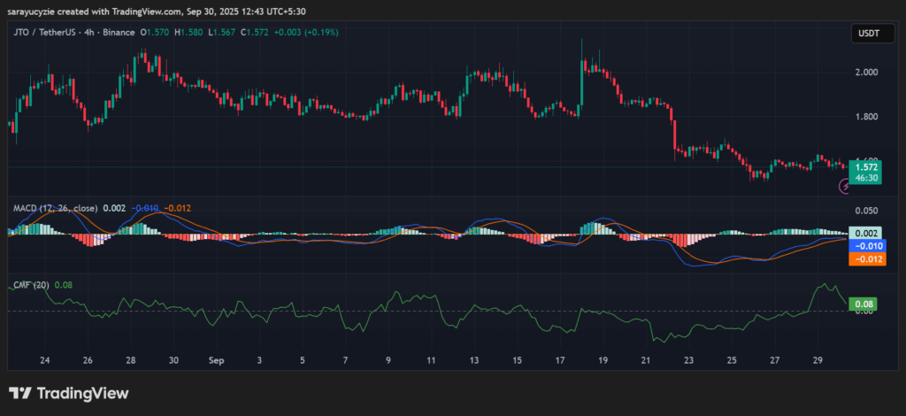 Jito(JTO)当前价格徘徊在1.56美元附近。若1.60美元支撑位能够守住,则可能触发价格反弹至2.70美元水平。