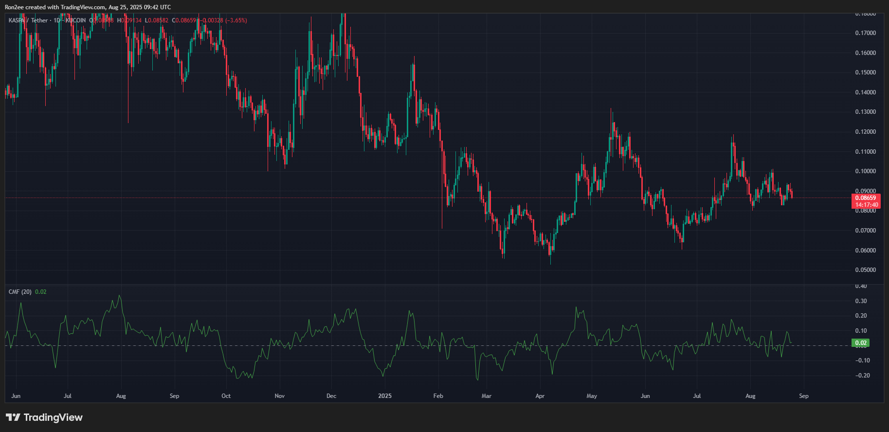 50日均线近期上穿200日均线形成金叉,这是重要的看涨信号。历史数据显示,上次出现金叉后两个月内KAS涨幅达74%。此外,Chaikin资金流量指数显示买盘压力占优,暗示市场可能进入积累阶段。