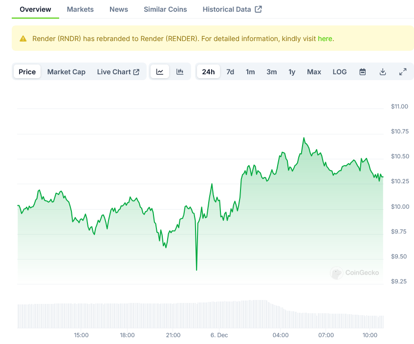 RNDR的交易量出现了惊人的增长,飙升244.93%至42.3亿美元。这一交易活动的激增推动该代币的市值突破50亿美元大关,使RNDR成为当天加密货币市场的顶级表现者之一。