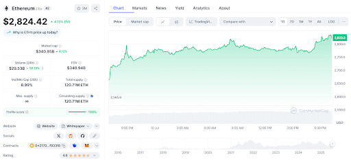以太坊今日上涨4%,从日内低点2660.5美元攀升至2824美元。交易量激增61%,达到295亿美元,显示市场活跃度显著提升。