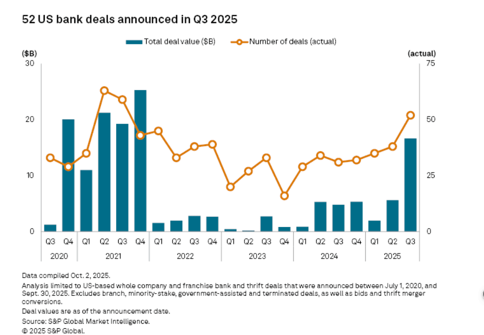 美国银行业并购浪潮正汹涌而至——2025年第三季度已宣布52笔交易,创2021年以来最繁忙季度记录,交易总值约166.3亿美元,为近年峰值。这波并购热潮背后是监管阻力的减弱和估值改善带来的行业信心。对加密市场而言,这释放出微妙而重要的信号:若银行通过并购提升规模稳定性,常会波及风险资产的信贷风险或暂时受控。强劲的并购动能可能为加密市场极端下跌提供缓冲,使SOL价格在宏观动荡中获得喘息空间。