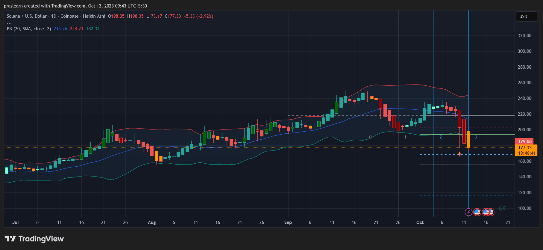 SOL/USD日线图(Heikin Ashi蜡烛)显示明确看跌动能。Solana价格近期收于布林带下轨下方,表明下行压力已达极端水平。历史数据显示,此类走势后往往出现向中轨(当前约213美元)的短期反弹。目前SOL价格徘徊于177美元附近,190-195美元为初步阻力位,205-210美元区域存在更强压制。若无法收复这些关键区域,空头将继续主导。下行方面,175-172美元构成短期关键支撑,失守后将打开通往165美元甚至150美元(恐慌重现时)的通道。