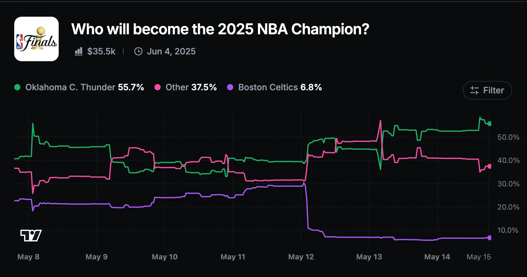 随着NBA季后赛的激烈进行,Myriad上最活跃的预测市场本周继续保持波动。在上周的更新中,与传统的体育博彩相比,Myriad上的预测者略微降低了俄克拉荷马城雷霆队或波士顿凯尔特人队今年夺冠的概率。