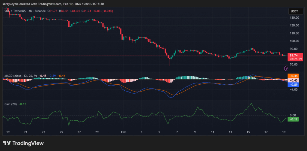 此外,佳庆资金流指标(CMF)位于-0.12水平,表明SOL市场存在适度卖压。该数值显示资金正在流出资产,呈现分布趋势。值得注意的是,若指标进一步跌破零值,卖出倾向将更为强烈。