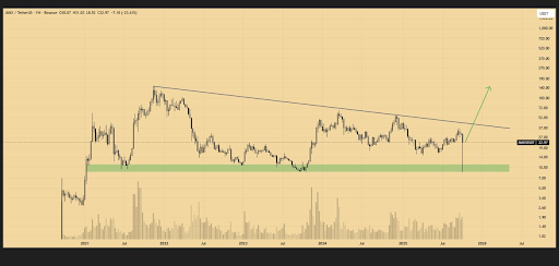 在币安周线图上,AVAX仍受制于2021年底历史高点形成的长期下降趋势线。该线压制价格上行,形成多个渐次降低的高点。每当AVAX尝试突破时,价格都会回落。若能成功突破,价格或可上探100-140美元区间。